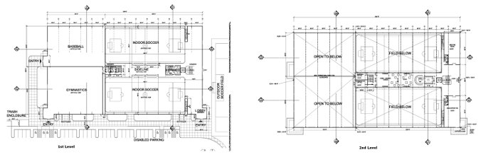 The facility includes a 71,300 square-foot recreational building with fields and courts on the ground floor and a 14,400 square foot 2nd floor viewing deck. The ceiling height and field sizes meet the national recreational standards for soccer and other field/court sports. Indoor facilities include: