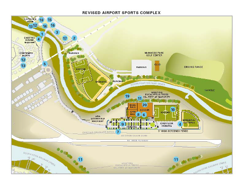 The site plan shows the proposed Sports Complex is adjacent to the existing San Rafael Airport to the south and the existing 450 acre Marin County McInnis Park and the McInnis Park Golf Center, a private recreation facility to the north. McInnis Park is a multi-use sports / outdoor activity facility and includes a skate park, two softball fields, two soccer fields, canoe launch, four tennis courts, a group picnic area and nature trails. McInnis Park Golf Center is a private recreation facility open to the public for a fee and includes a nine-hole executive golf course, driving range, miniature golf, batting cages, pro shop and clubhouse with a bar and restaurant.